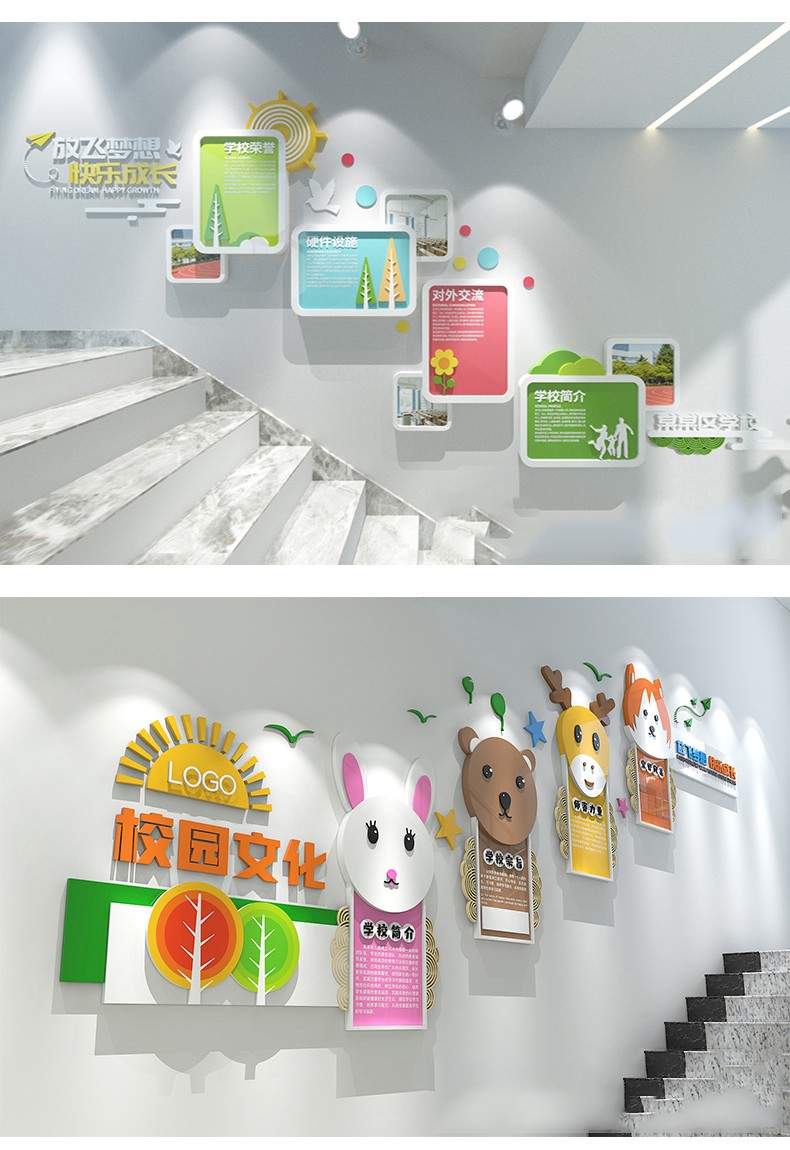 幼兒園學生還正處于幼童的發展時期,這一階段的培養目標主要是讓學生在玩中學,感受知識的樂趣。文化墻建設要符合幼兒的喜好,在色彩的設計上要色彩鮮明,比如紅色、黃色、綠色、金色、藍色等醒目的顏色,可以充分發揮想象力使得校園文化墻豐富多彩,有吸引力。