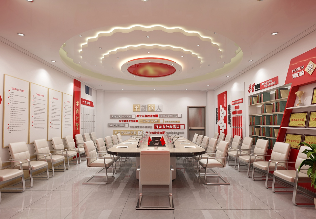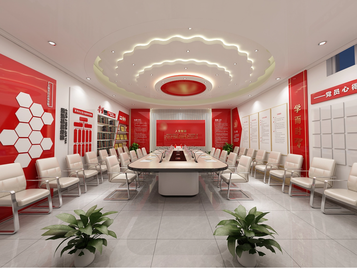 根據房間的大小進行規劃布局,規劃的內容有:背景墻、黨旗+入黨誓詞(宣誓墻)、光輝歷程、中國精神、黨建書屋(紅色加油站)、榮譽墻、黨員風采等,房間大一些,內容則可多放一些,房間小,則可選取重點的內容規劃即可。