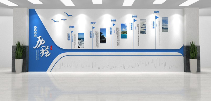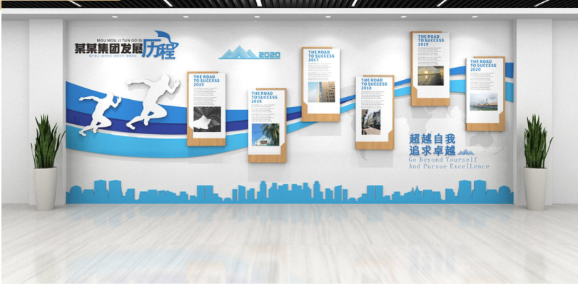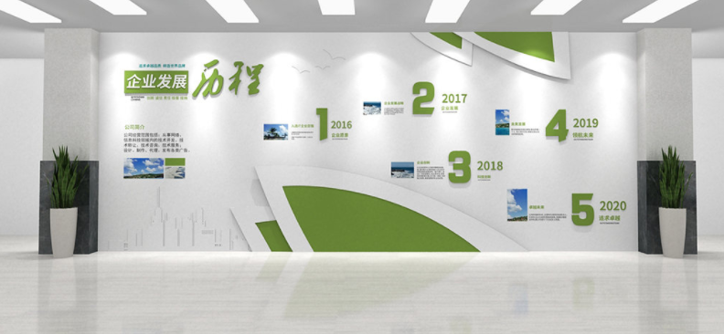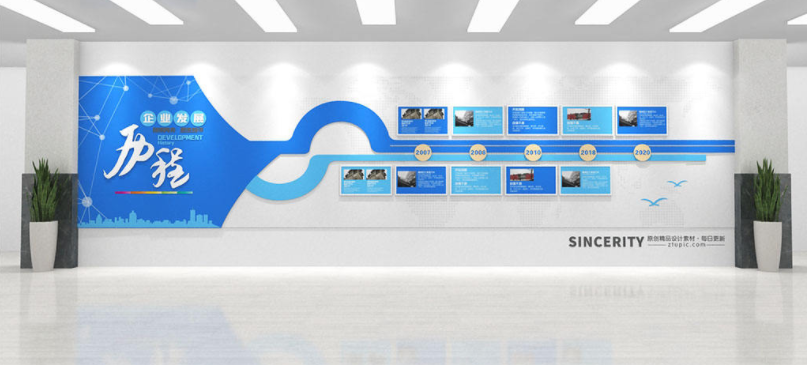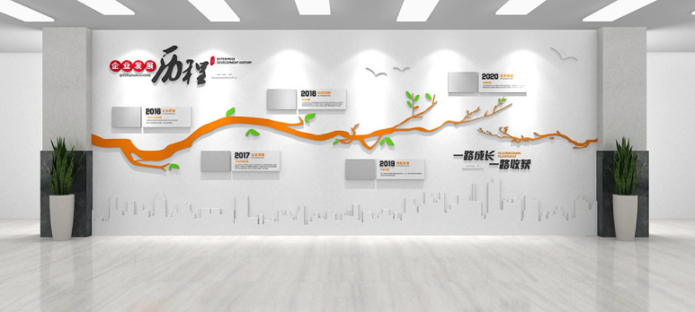 其次在公司的發展過程,這些年下來我們肯定取得了很多進步以及榮譽,比如公司一開始5個人創業。到現在100人左右,經過這幾年的時間,每一年我們新增員工多少人,新增部門多少個,員工的榮譽以及公司的榮譽有哪些,我們公司的產品更替有哪些重要時間點,以及公司的經營理念變更都可以寫入我們的歷史文化墻,所謂歷史就是記錄一些比較深刻值得記下來的事情。用圖文的形式進行完美的展示,重大事件還可以用不同的顏色來進行設計,在我們同類色彩的搭配上再加上突出的顏色,會顯得非常有條理性。